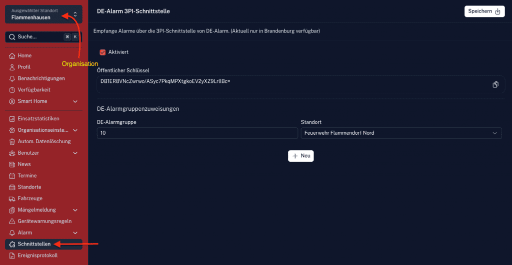 - Diesen Schlüssel musst du nun an die Leitstelle übermitteln. Bis der Schlüssel von der Leitstelle hinterlegt wurde, können noch keine Einsätze empfangen werden. Die Schnittstelle befindet sich in einem fehlerhaften Zustand. Dies wird mit einem Flag gekennzeichnet. Sobald der Schlüssel in der Leitstelle hinterlegt wurde, wechselt die Schnittstelle in einen funktionsfähigen Zustand. Dies wird ebenfalls mit einem Flag gekennzeichnet.