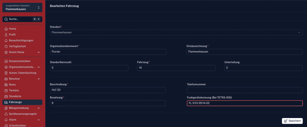 Damit die Einsatzmittel richtig dem Einsatz zugeordnet werden können, muss im Feld Funkgerätekennung des entsprechenden Fahrzeuges der Funkrufname eingetragen. Die Schreibweise ist hier z.B.